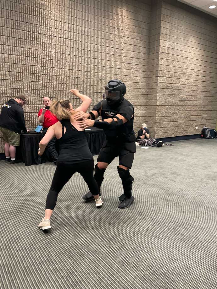 The training injects stress by simulating real criminal attacks. The intense scenarios with padded assailants allow you to develop the mental readiness and muscle memory needed in emergencies. This prepares you both physically and psychologically to react reflexively if threatened.